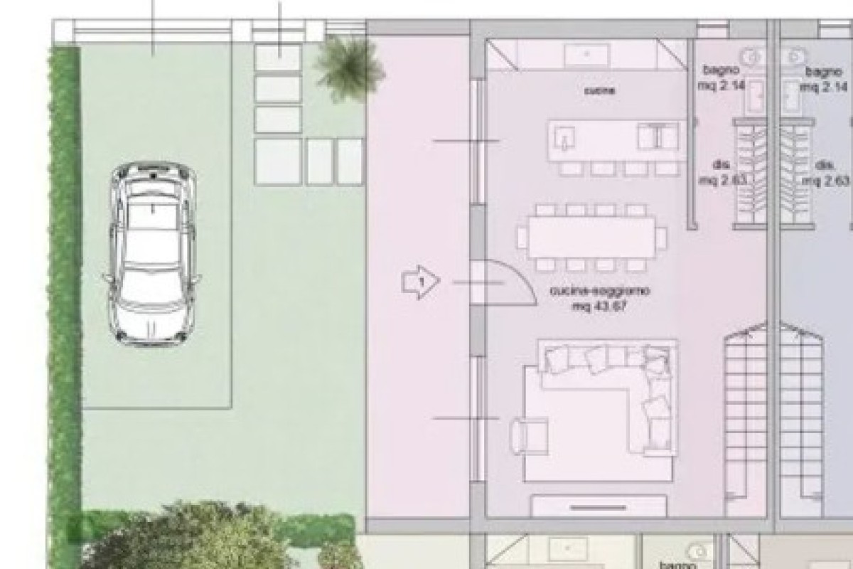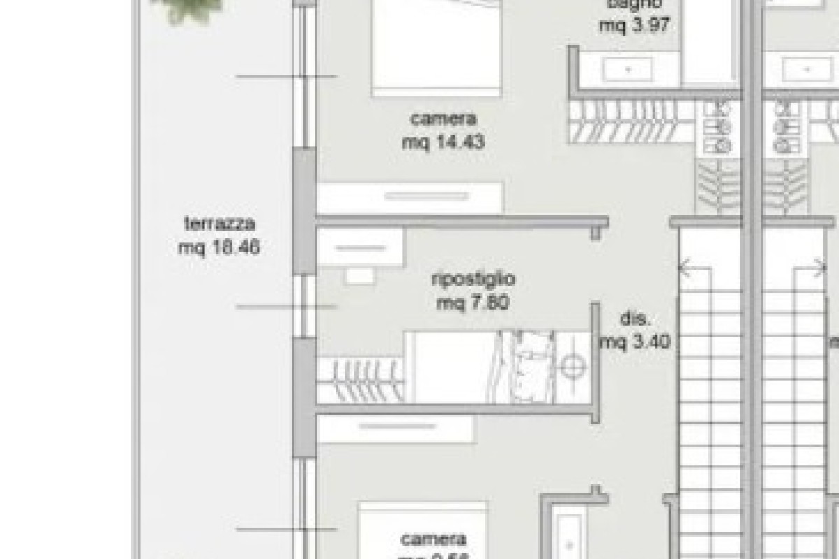 Semidipendente libera su tre lati - 121 m2, due posti auto, accesso privato, 2 camere da letto, 1 caretta, 2 bagni (uno di servizio), portico - 19mq, terrazza - 12 + 19 mq, roof top privato.
